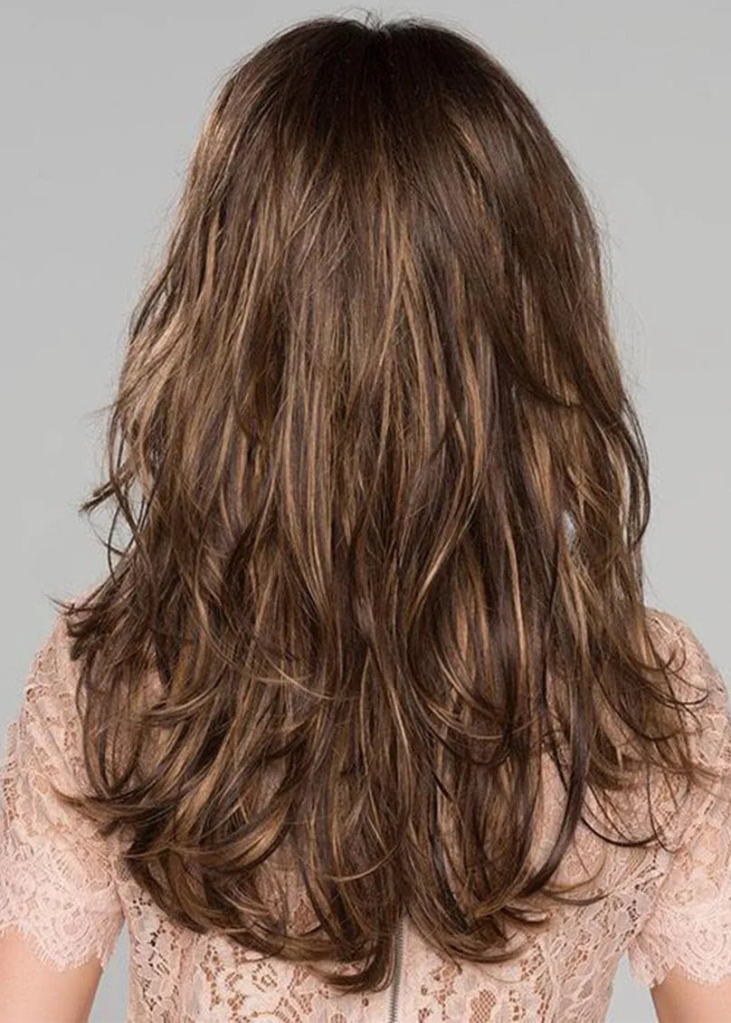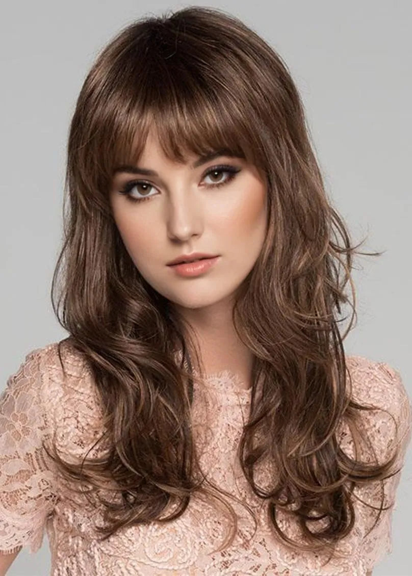 Women's Long Layered Wavy Human Hair Wigs With Bangs Capless Wigs 22Inch